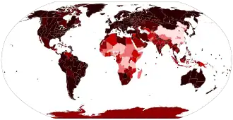 Acima de 10 000 casos por milhão de habitantes 3 000–10 000 casos por milhão de habitantes 1 000–3 000 casos por milhão de habitantes 300–1 000 casos por milhão de habitantes 100–300 casos por milhão de habitantes 0–100 casos por milhão de habitantes Sem casos confirmados, sem população ou sem dados disponíveis | |