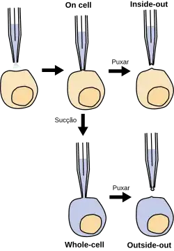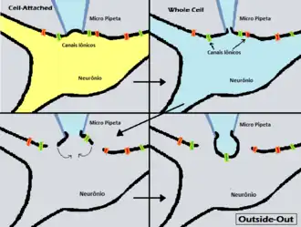 . PMID 27341060. doi:10.3791/54024. Consultado em 2 de março de 2023 - ↑ Staley, K. J.; Otis, T. S.; Mody, I. (1 de maio de 1992). «Membrane properties of dentate gyrus granule cells: comparison of sharp microelectrode and whole-cell recordings». Journal of Neurophysiology (em inglês) (5): 1346–1358. ISSN 0022-3077. doi:10.1152/jn.1992.67.5.1346. Consultado em 2 de março de 2023