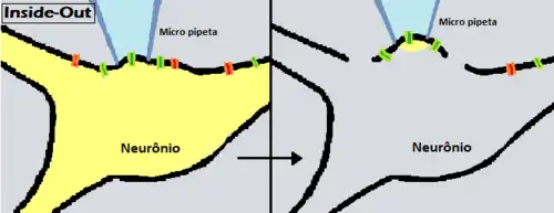 No método Inside-out – lado de dentro para fora, um giga-selo é estabelecido entre a pipeta e a célula, exatamente como no Cell-attached, a pipeta é puxada, separando o pedaço de membrana do restante da célula. A remoção de um fragmento de membrana geralmente resulta inicialmente na formação de uma vesícula de membrana na ponta da pipeta, porque as extremidades da membrana se fundem rapidamente após a excisão. A face externa da vesícula deve então ser aberta para entrar no modo Inside-out; isso pode ser feito levantando a pipeta no ar e abaixando em outro banho com solução com baixo teor de Ca2+, resultando na abertura da vesícula, expondo o lado de dentro da célula para fora[2]. Uma vantagem deste método é que o pesquisador tem acesso à superfície intracelular da membrana, podendo alterar a composição química do banho que estará em contato com a superfície interna da célula. Isso é útil quando se deseja manipular o ambiente na superfície intracelular dos canais iônicos. Por exemplo, os canais que são ativados por ligantes intracelulares podem então ser estudados por meio desta técnica.