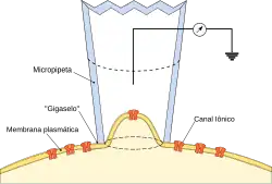 Durante um ensaio de patch clamp, um tubo de vidro oco com poucos milímetros de diâmetro conhecido como micropipeta, é preenchido com uma solução eletrolítica e um eletrodo de registro conectado a um amplificador. A micropipeta é então colocada em contato com a membrana de uma célula isolada ou fragmento de tecido. Outro eletrodo é colocado em um banho ao redor da célula ou tecido, atuando como terra de referência. Um circuito elétrico pode ser formado entre o eletrodo de registro e o de referência, com a célula de interesse no meio.