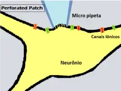 . PMID 2459299. doi:10.1085/jgp.92.2.145. Consultado em 2 de março de 2023 - ↑ Linley, John E. (2013). Gamper, Nikita, ed. «Perforated Whole-Cell Patch-Clamp Recording». Totowa, NJ: Humana Press: 149–157. ISBN 978-1-62703-350-3. doi:10.1007/978-1-62703-351-0_11. Consultado em 2 de março de 2023
