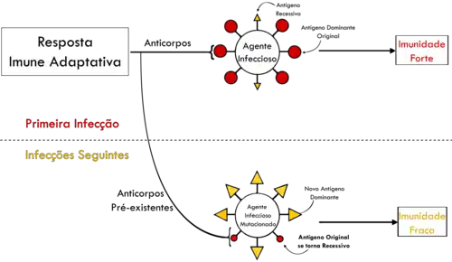 Entre infecções primárias e secundárias ou após a vacinação, um vírus pode sofrer desvio antigênico, no qual as proteínas de superfície viral (os epítopos) mudam através de mutação natural. Isso permite que o vírus escape do sistema imunológico. O vírus alterado reativa preferencialmente células B de memória de alta afinidade previamente ativadas e estimula a produção de anticorpos. No entanto, os anticorpos produzidos geralmente se ligam de maneira ineficaz aos epítopos alterados. Além disso, esses anticorpos inibem a ativação de células B naïves que poderiam produzir anticorpos mais eficazes contra o segundo vírus. Isso leva a uma resposta imunológica menos eficaz e infecções recorrentes podem demorar mais para serem eliminadas.[3]