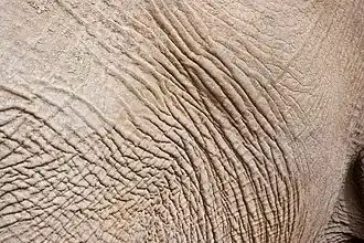 A pelagem é um pelo denso.[9] Principalmente, a pelagem aumenta o isolamento térmico que a pele proporciona, mas também pode servir como característica sexual secundária ou como camuflagem. Em alguns animais, a pele é muito dura e grossa e pode ser processada para criar couro. Os répteis e a maioria dos peixes têm escamas protetoras duras em sua pele, e as aves têm penas duras, todas feitas de beta-queratinas resistentes. A pele dos anfíbios não é uma barreira forte, especialmente no que diz respeito à passagem de substâncias químicas pela pele, e está frequentemente sujeita a osmose e forças difusivas. Por exemplo, uma rã sentada em uma solução anestésica seria sedada rapidamente à medida que a substância química se difundisse pela pele. A pele dos anfíbios desempenha um papel fundamental na sobrevivência e em sua capacidade de explorar uma ampla variedade de habitats e condições ecológicas.[10]