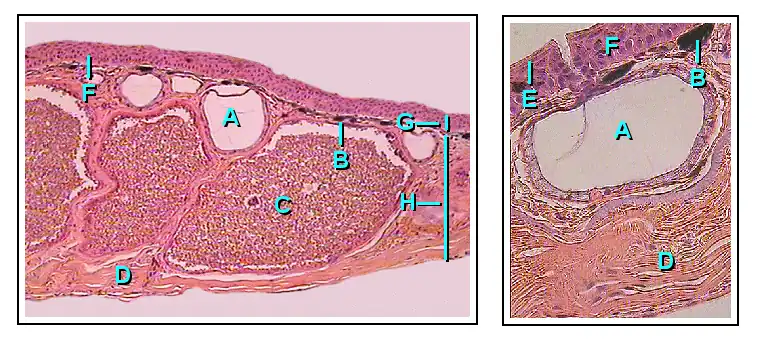 Os dutos da glândula mucosa aparecem como tubos verticais cilíndricos que rompem a camada epidérmica até a superfície da pele. As células que revestem o interior dos ductos são orientadas com seu eixo longitudinal formando ângulos de 90 graus em torno do ducto de forma helicoidal.[34]