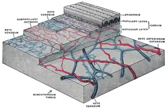 ![]() A distribuição dos vasos sanguíneos na pele da planta do pé. (Corium - termo alternativo para derme - está identificado no canto superior direito). | |