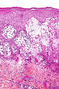 | Micrografia do penfigoide gestacional com as bolhas sub-epidérmicas características e eosinófilos abundantes. | |