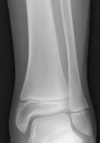 ![]() Radiografia da parte inferior da perna de uma criança de 12 anos, mostrando placa epifisária em crescimento na tíbia e na fíbula. | |