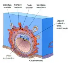 Logo após aderir ao endométrio o trofoblasto começa a proliferar rapidamente, e gradualmente se diferencia em duas camadas uma interna de citotrofoblasto, uma camada de células mononucleadas mitoticamente ativa e que forma novas células que migram para a massa crescente de sinciciotrofoblasto onde se fundem e perdem suas membranas celulares; e uma externa de sinciciotrofoblasto formada por uma massa protoplasmática multinucleada, na qual nenhum limite celular pode ser observado.