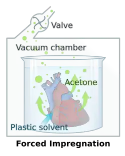 Quatro etapas são seguidas no processo padrão de plastinação: fixação, desidratação, impregnação forçada a vácuo e endurecimento.[3] A água e os tecidos lipídicos são substituídos por polímeros curáveis, que incluem silicone, epóxi e copolímero de poliéster.[3]