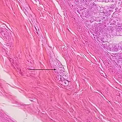 A seta aponta o plexo submucoso em corte histológico de intestino delgado.