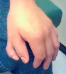 | Uma mão de um jovem de 27 anos com polidactilia. | |