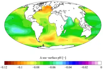 A acidificação oceânica é a designação dada à diminuição do pH nos oceanos, significando aumento da acidez, causada pelo aumento do gás carbônico atmosférico (dióxido de carbono, CO2), que se dissolve na água alterando o seu equilíbrio químico. Desde o início da Revolução Industrial, quando as emissões de carbono iniciaram uma rápida escalada, o pH da superfície oceânica diminuiu cerca de 0,1 na escala logarítmica do pH. Embora essa diferença pareça pequena pelo tipo de escala utilizada, representa um aumento de cerca de 26% na concentração de íons hidrogênio H+, os responsáveis diretos pela acidificação.[52]