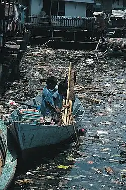 Despejos, derramamentos de contêineres, lixo levado para bueiros e cursos d'água e resíduos de aterros sanitários levados pelo vento contribuem para esse problema. Esse aumento na poluição da água causou sérios efeitos negativos, como redes de pesca descartadas capturando animais, concentração de resíduos plásticos em grandes manchas de lixo marinho e aumento das concentrações de contaminantes na cadeia alimentar.