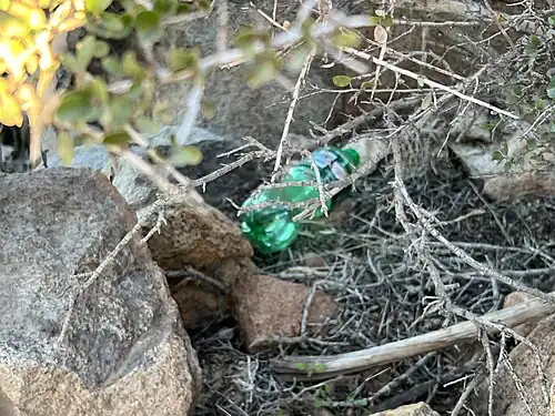 - Garrafa plástica de Canada Dry em trilha de caminhada nos Estados Unidos adjacente a uma trilha de caminhada urbana.