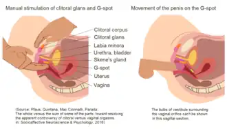 A existência do ponto G não foi comprovada, nem sequer a origem da ejaculação feminina.[3][4] Embora o ponto G tenha sido estudado desde a década de 1940,[5] há divergências sobre sua existência como uma estrutura com definição e localização distintas.[3][6][7] O ponto G pode ser uma extensão do clitóris, que juntos podem ser a causa dos orgasmos vaginais.[7][8][9] Sexólogos e outros pesquisadores estão preocupados com o fato de que as mulheres podem se considerarem disfuncionais caso não experimentarem a estimulação do ponto G, e enfatizam que não experimentá-lo também é normal.[4]