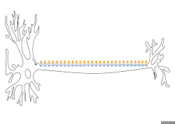 Figura 3. Representação da Bainha de mielina e Nódulos de Ranvier (onde há concentração de canais de sódio dependentes de tensão elétrica). Na figura podemos observar o início de um potencial de ação (à esquerda) com a despolarização, abertura dos canais e influxo de íons, e a propagação da corrente local em direção ao próximo nódulo.