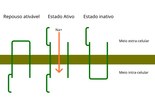 Figura 2. Três situações possíveis para os canais de íon sódio dependentes de tensão elétrica. O período refratário absoluto corresponde aos estados ativo e inativo. No período refratário relativo, alguns canais estão em repouso ativável, enquanto no potencial de repouso de membrana, todos estão.