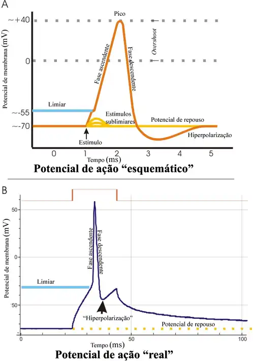 A. É uma visão esquemática do potencial de ação idealizado. Ilustra as suas várias fases à medida que ele percorre um único ponto da membrana plasmática. B. Registros reais de potenciais de ação são comumente distorcidos em comparação às visões esquemáticas devido a variações nas técnicas eletrofisiológicas de registro.