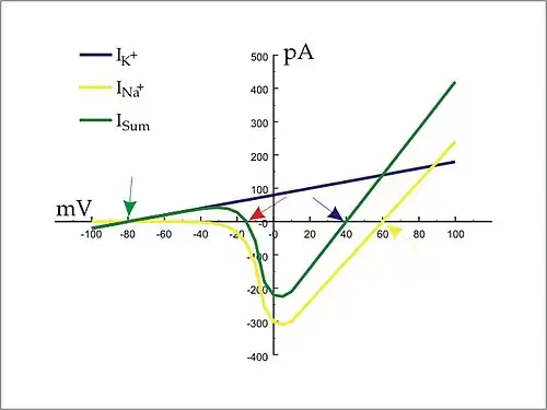• A seta vermelha indica o potencial limiar. É a partir deste potencial que a corrente iônica passa a ter resultado líquido em direção ao interior da célula. Note que este cruzamento se dá a uma corrente nula, mas exibe uma inclinação negativa. Qualquer tensão elétrica menor que o limiar tende a fazer a célula retornar ao potencial de repouso e qualquer tensão elétrica maior que o limiar faz com que a célula se despolarize. Esta despolarização leva a um maior influxo de íons, desta forma a corrente de sódio se regenera. O ponto no qual a linha verde atinge seu valor mais negativo é o ponto no qual todos os canais de sódio estão abertos. Despolarizações além desse ponto diminuem o influxo de sódio, conforme a força eletroquímica (driving force) diminui com a aproximação do potencial de membrana do ENa.