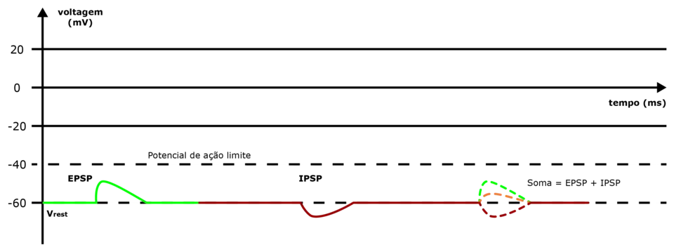 Esse sistema[1] de IPSPs pode ser temporariamente somado com EPSPs acima ou abaixo do limite para reduzir a amplitude do potencial pós-sináptico resultante. EPSPs equivalentes (positivos) e IPSPs (negativos) podem anular-se mutuamente quando somados. O equilíbrio entre os EPSPs e IPSPs é muito importante para a integração de informação elétrica produzida por sinapses inibitórias e excitatórias.
