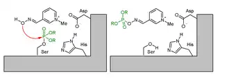 Os organofosforados inibem a colinesterase pela fosforilação da enzima. A pralidoxima reativa a acetilcolinesterase por remover o grupo fosforil ligado ao grupo éster da proteína. Nesta reação, tanto os organofosforados, como a pralidoxima são mutuamente inativados. Estes produtos são submetidos a um rápido metabolismo, levando à remoção dos organofosforados.