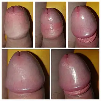 O prepúcio é tipicamente retrátil sobre a glande. A cobertura da glande em estado flácido e ereto varia dependendo do comprimento do prepúcio.[1] O prepúcio é anexado à glande no momento do nascimento e não é geralmente retrátil na infância.[2] A idade em que o prepúcio pode retrair varia, mas uma pesquisa descobriu que 95% dos prepúcios eram capazes de retrair completamente na idade adulta.[3] A incapacidade de retrair o prepúcio na infância não deve ser considerado um problema a menos que existam outros sintomas.[4]