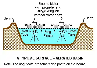 A maioria dos processos de oxidação biológica para tratamento de efluentes industriais tem em comum o uso de oxigênio (ou ar) e a ação microbiana. Tanques com aeração superficial atingem uma remoção de 80 a 90% de BBO com tempos de retenção de 1 a 10 dias.[20] As bacias podem variar em profundidade de 1,5 a 5,0 metros (4,9 a 16,4 pés) e utilizam aeradores motorizados que flutuam na superfície das águas residuais.[20]