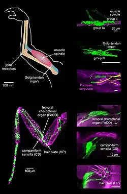 - Fuso muscular, que se divide em dois subtipos, fuso neuromuscular de bolsa, e de cadeia nuclear, sendo estes responsáveis pelo comprimento da fibra muscular no repouso (postura) e durante o movimento.