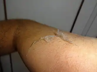| Um jovem exibindo uma queimadura moderada. Note-se que a intensidade da vermelhidão não corresponde necessariamente ao grau de dano da pele. [carece de fontes] | |