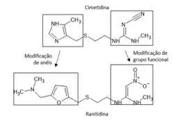 No caso, a Ranitidina se enquadra no que se chama de fármacos “me too”, fármacos desenvolvidos a partir de um protótipo. O princípio era impulsionar os efeitos terapêuticos da Cimetidina, por isso adotou-se o método de bioisosterismo, no qual consiste em substituir grupos dessas moléculas por outros com respostas semelhantes. A partir da Cimetidina, algumas mudanças estruturais, são elas modificações bioisostéricas do anel imidazólico e do grupamento funcional cianoguanidina do protótipo, resultaram em um aumento da potência e maior seletividade pelos receptores histaminérgicos no subtipo 2, assim aumentando a eficácia e dando origem a Ranitidina que é um fármaco até 10 vezes mais potente que seu antecessor.