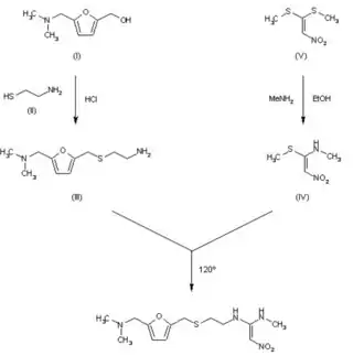 A síntese do cloridrato de ranitidina acontece através de diversas rotas sintéticas. Uma dessas rotas, no qual é utilizada em um dos laboratórios que produzem a matéria prima deste fármaco, se inicia a partir da reação de 5-dimetilaminometil-2-furanilmetanol (I) com 2-mercaptoetilamina (II) por meio de ácido clorídrico resultando em 2-[[(5-dimetilamino-metil-2-furanil)metiltio]etaneamina (III) que após isso, é condensado a 120°C com N-metil-1-metiltio-2-nitrotenamina (IV), este que é obtido como resultado da reação de 1,1-bis(metiltio)-2-nitroeteno (V) com metilamina em etanol a refluxo, assim nos dando a ranitidina[14].