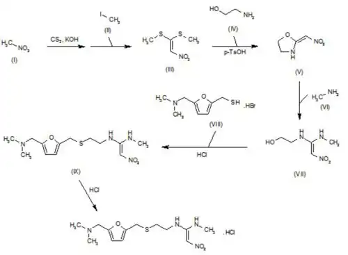 Há uma outra rota utilizada, que se inicia a partir da condensação de nitrometano (I) com CS2 na presença de KOH, seguida por dialquilação do ditiocarboxilato intermediário com iodometano (II) dá 1,1,-bis(metilsulfanil)-2-nitroetileno (III). A condensação deste intermediário com 2-aminoetanol (IV) na presença de p-TsOH em EtOH origina 2(E)-(nitrometileno)oxazolidina(V), que então se acopla com metilamina (VI) produzindo 2-[1(E)-(metilamino)-2-nitrovinilamino]etanol (VII). A condensação de álcool primário com 5-(dimetilaminometil)-2-furilmetanotiol (VIII) na presença de ácido clorídrico a 0°C fornece ranitidina (IX), que é então tratada com HCl em EtOH, EtOH/H2O, EtOH/tolueno ou i-PrOH para fornecer o cloridrato de ranitidina[14].