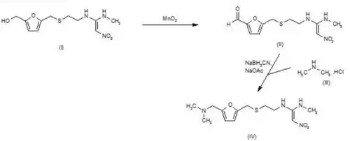 Apesar de ambas as rotas serem utilizadas na indústria, existe um estudo que relata uma rota mais simples que resulta em um maior rendimento e pureza do produto. Este consiste na oxidação de [5-[2-[1-(metilamino)-2-nitrovinilamino]etilsulfanilmetil]-2-furil]metanol (I) com MnO2 em CH2Cl2 fornecendo um produto que é posto a aminação redutiva com cloridrato de dimetilamina (III) na presença de NaBH3CN e NaOAc em MeOH fornecendo cloridrato de ranitidina (IV).[14]