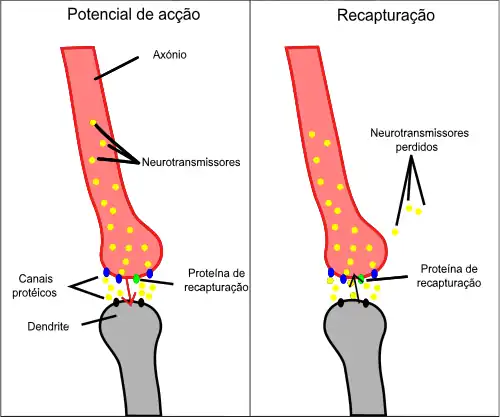 Uma sinapse antes e durante a recaptação. Note que alguns neurotransmissores foram perdidos e não foram reabsorvidos.