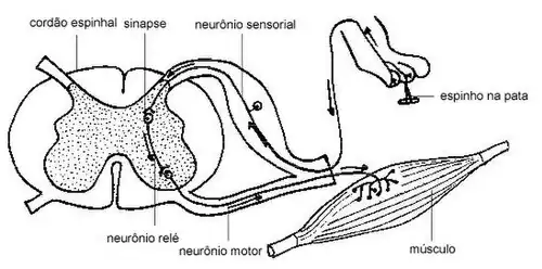 O reflexo, pode ser definido, como uma resposta involuntária rápida, consciente ou não, que visa uma proteção ou adaptação do organismo sendo originado de um estímulo externo, realizada antes mesmo do cérebro tomar conhecimento do estímulo periférico, consequentemente, antes deste comandar uma resposta, efetuada então, a partir de uma decisão tomada na substância cinzenta[5] da medula espinhal e/ou do bulbo. O arco reflexo é a via nervosa responsável por tal conexão.[6]