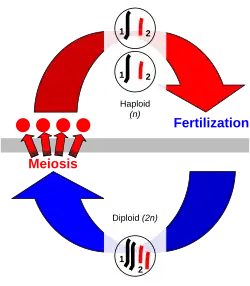 Quando se dá a fecundação, também ocorre outro fenómeno — a cariogamia — que consiste na fusão dos núcleos dos dois gâmetas. Os núcleos dos gâmetas fundem-se e cada gâmeta contribui com metade do material genético do zigoto. Depois que estes processos ocorrem, forma-se o ovo (célula ovo) ou zigoto que, por mitoses sucessivas (sem alteração no número de cromossomas), vai originar um novo indivíduo. Nas plantas, a fase diploide, conhecida como esporófito, produz esporos por meiose. Esses esporos então germinam e dividem-se por mitose para formar uma fase multicelular haploide, o gametófito, que produz gâmetas diretamente por mitose. Este tipo de ciclo de vida, envolvendo alternância entre duas fases multicelulares, o gametófito sexual haploide e o esporófito diploide assexuado, é conhecido como alternância de gerações. Conquanto, por meiose, o número diploide de cromossomas é reduzido à metade (n — haploide); e pela fecundação, restabelece-se o número 2n (diploide) típico da espécie. Dessa maneira, ocorrem a troca e a mistura de material genético entre indivíduos de uma população, aumentando a variabilidade genética.