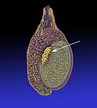 ![]() Posição do rete testis dentro do testículo. | |