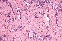 Micrografia do rete testis envolvida por seminoma. Mancha de H&E.