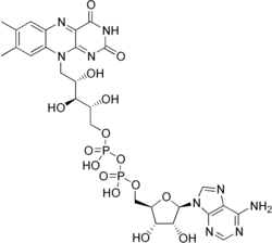 A riboflavina é a molécula precursora do FAD[18] e do FMN.[19] O FMN é obtido com a fosforilação da riboflavina por acção da enzima riboflavina cinase, enquanto que a FAD sintetase é a responsável pela síntese do FAD. O FAD é por isso considerado a forma biologicamente activa da riboflavina.[18]