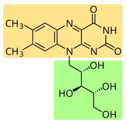 Estrutura da riboflavina evidenciando o grupo flavina (caixa superior, a amarelo) e o grupo ribitilo (caixa inferior, a verde).