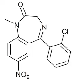 - ↑ Fukuda H, Kudo Y, Ono H, Togari A, Tanaka Y (janeiro 1977). «[Pharmacological study on 5-(o-chlorophenyl)-1-methyl-7-nitro-1,3-dihydro-2H-1,4-benzodiazepin-2-one (ID-690), with special reference to the effects on motor systems]». Nihon Yakurigaku Zasshi. Folia Pharmacologica Japonica (em japonês). 73 (1): 123–34. PMID 558942. doi:10.1254/fpj.73.123