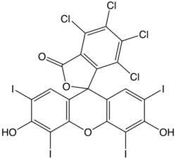 Rosa bengala (4,5,6,7-tetracloro-2',4',5',7'-tetraiodofluoresceína) é um corante. Seu sal de sódio é comumente usado em colírios para a detecção de células danificadas da conjuntiva e córnea e consequentemente identificar danos ao olho.[1] O corante também é usado na preparação de Foraminiferas para análises microscópicas, permitindo a distinção entre as formas que estavam vivos ou mortos no momento da coleta.