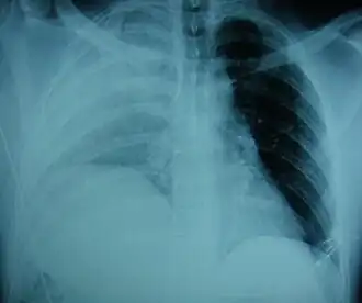 | Uma radiografia mostrando um diafragma elevado à direita[1] | |