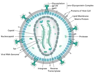 O HIV é um membro do gênero Lentivirus,[102] parte da família Retroviridae.[103] Os lentivírus compartilham muitas características morfológicas e biológicas. Muitas espécies de mamíferos são infectadas pelos lentivírus, que são tipicamente responsáveis ​​por doenças de longa duração, com um longo período de incubação.[104] Os lentivírus são transmitidos como um vírus de RNA em sentido positivo. Após a entrada na célula-alvo, o genoma do RNA viral é convertido em DNA de cadeia dupla através de uma transcriptase reversa codificada pelo vírus, que é transportada juntamente com o genoma viral na partícula do vírus. O DNA viral resultante é depois importado para o núcleo da célula e integrado ao DNA celular por uma integrase codificada pelo vírus.[105] Uma vez integrado, o vírus pode tornar-se latente, permitindo que ele e sua célula hospedeira não sejam detectados pelo sistema imunológico.[106] Alternativamente, o vírus pode ser transcrito, produzindo novos genomas de RNA e proteínas virais que são "empacotados" e liberados a partir da célula como novas partículas virais, que então começam o ciclo de replicação de novo.[107]