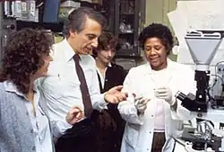Robert Gallo, codescobridor do HIV no início dos anos 1980 entre (da esquerda para a direita) Sandra Eva, Sandra Colombini e Ersell Richardson.