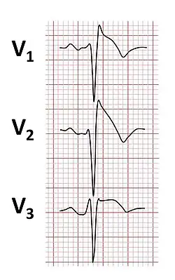 As alterações eletrocardiográficas consistem em elevação do segmento ST-T nas derivações V1 -V3, associada a bloqueio completo ou incompleto do ramo direito e onda T negativa.