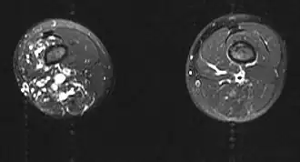 - ↑ McDonagh, B; Sorenson, S; Cohen, A; Eaton, T; Huntley, D E; La Baer, S; Campbell, K; Guptan, R C (2005). «Management of venous malformations in Klippel–Trenaunay syndrome with ultrasound-guided foam sclerotherapy». Phlebology. 20 (2): 63–81. doi:10.1258/0268355054069188