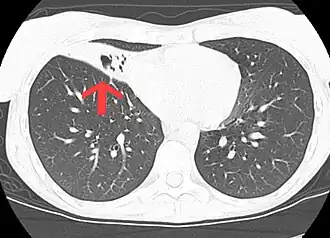| CT scan de múltiplos nódulos e bronquiectasia nos lóbulos médios pulmonares | |