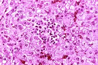 | Imagem microscópica do fígado de uma criança que morreu em consequência de síndrome de Reye. | |