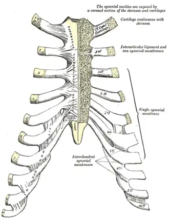 | Articulações esternocostal e intercondral. Vista anterior. (Cartilagens costais visíveis no diagrama.) | |